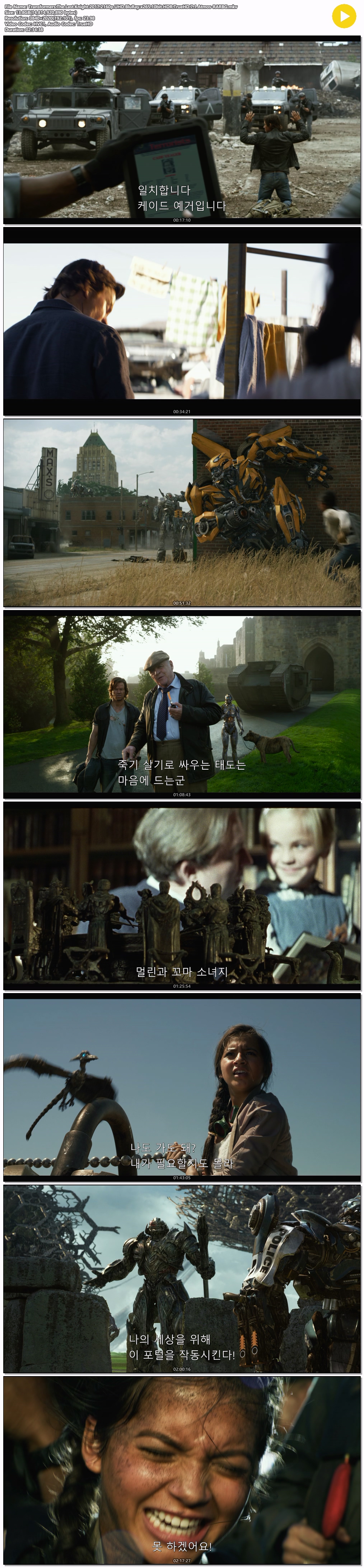 영화 [4K] 트랜스포머5 .2017.2160p.UHD.BluRay.... HOT #트랜스포머5 #10bit #TrueHD [4K] 트랜스포머5 .2017.2160p.UHD.BluRay.x265.10bit.HDR.TrueHD.7.1 ro*** 2026.04.10 5,797 316 영화 다운로드 (2개 파일) Transformers.The.Last.Knight.2017.2160p.UHD.BluRay.x265.10bit.HDR.TrueHD.7.1.Atmos-RARBG.mkv 13.8 GB 다운로드 Transformers.The.Last.Knight.2017.2160p.UHD.BluRay.x265.10bit.HDR.TrueHD.7.1.Atmos-RARBG.smi 다운로드 개인 소장 목적으로만 이용 가능합니다. 재배포·상업적 이용 금지. TAGS #트랜스포머5 #10bit #TrueHD #Transformers #Last 추천 316 저장 공유 목록 관련 콘텐츠 영화 [비포 던] 서부전선 900일간의 전쟁 실화 마지막 전투의 새벽 4,949 영화 [주토피아 2] Zootopia 2. 2025 (완벽 자막, 초고화질) 4,970 영화 [데드풀과 울버린] Deadpool & Wolverine. 2024 (휴 잭맨, 라이... 3,956