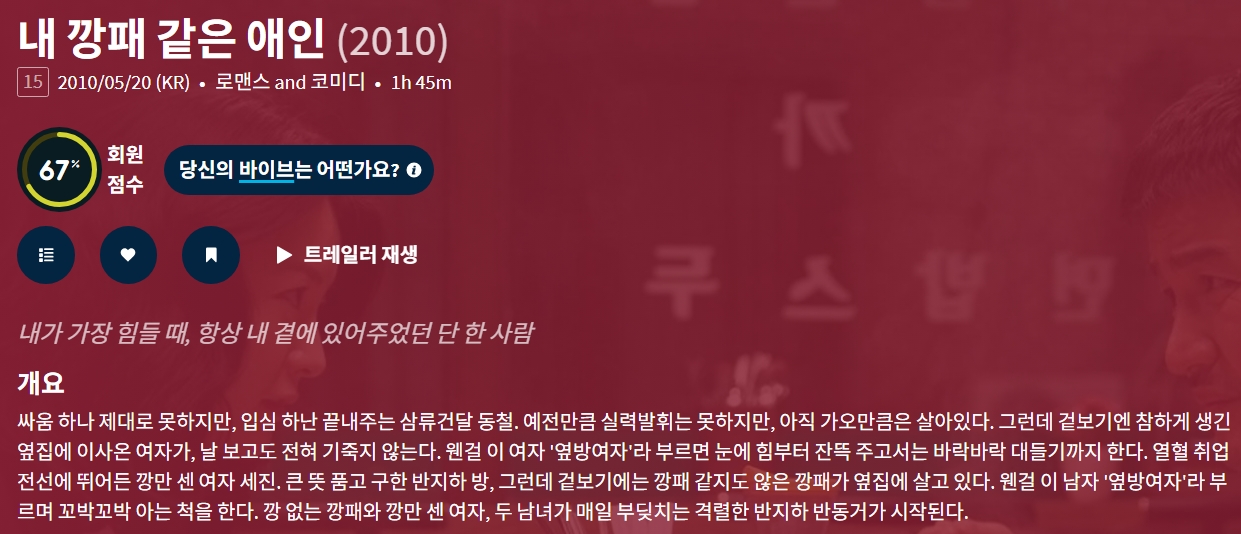 영화 내 깡패 같은 애인 "내가 가장 힘들 때, 항... HOT #깡패 #같은 #애인 내 깡패 같은 애인 "내가 가장 힘들 때, 항상 내 곁에 있어주었던 단 한 사람" gg*** 2026.04.10 5,064 456 영화 다운로드 (1개 파일) 내 깡패 같은 애인.mkv 1.4 GB 다운로드 개인 소장 목적으로만 이용 가능합니다. 재배포·상업적 이용 금지. TAGS #깡패 #같은 #애인 #내가 #가장 추천 456 저장 공유 목록 관련 콘텐츠 영화 [비포 던] 서부전선 900일간의 전쟁 실화 마지막 전투의 새벽 4,949 영화 [주토피아 2] Zootopia 2. 2025 (완벽 자막, 초고화질) 4,970 영화 [데드풀과 울버린] Deadpool & Wolverine. 2024 (휴 잭맨, 라이... 3,956