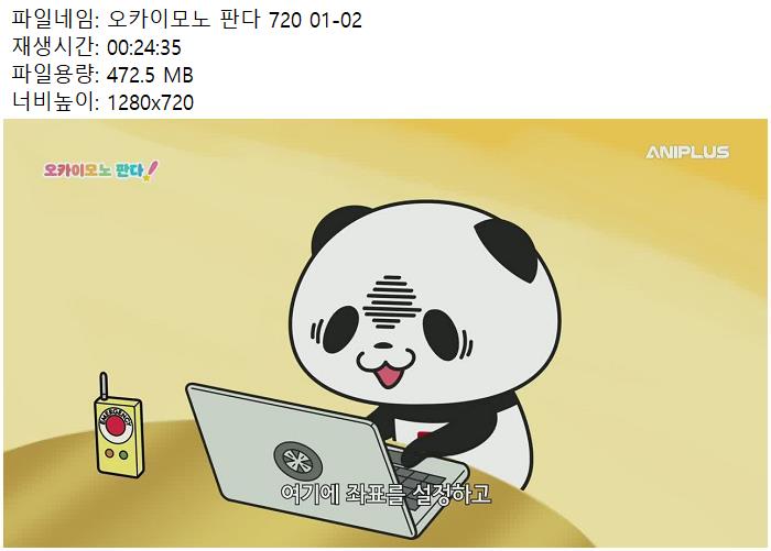 애니 오카이모노 판다 720 01-02 NEW HOT #오카이모노 #판다 #E01 오카이모노 판다 720 01-02 남미*** 2026.04.26 5,541 258 애니 다운로드 (2개 파일) 오카이모노 판다!.E01.250709.720p.H264-F1RST.mp4 943 MB 다운로드 오카이모노 판다!.E02.250716.720p.H264-F1RST.mp4 다운로드 개인 소장 목적으로만 이용 가능합니다. 재배포·상업적 이용 금지. TAGS #오카이모노 #판다 #E01 #H264 #F1RST 추천 258 저장 공유 목록 관련 콘텐츠 애니 스파이 패밀리 3기 (더빙).E07.260425.1080p.WANNA 7,116 애니 스파이 패밀리 3기 (더빙).E07.260425.720p.WANNA 5,568 애니 전생했더니 슬라임이었던 건에 대하여 4기 - 04화 (1920x1080 x2... 3,630